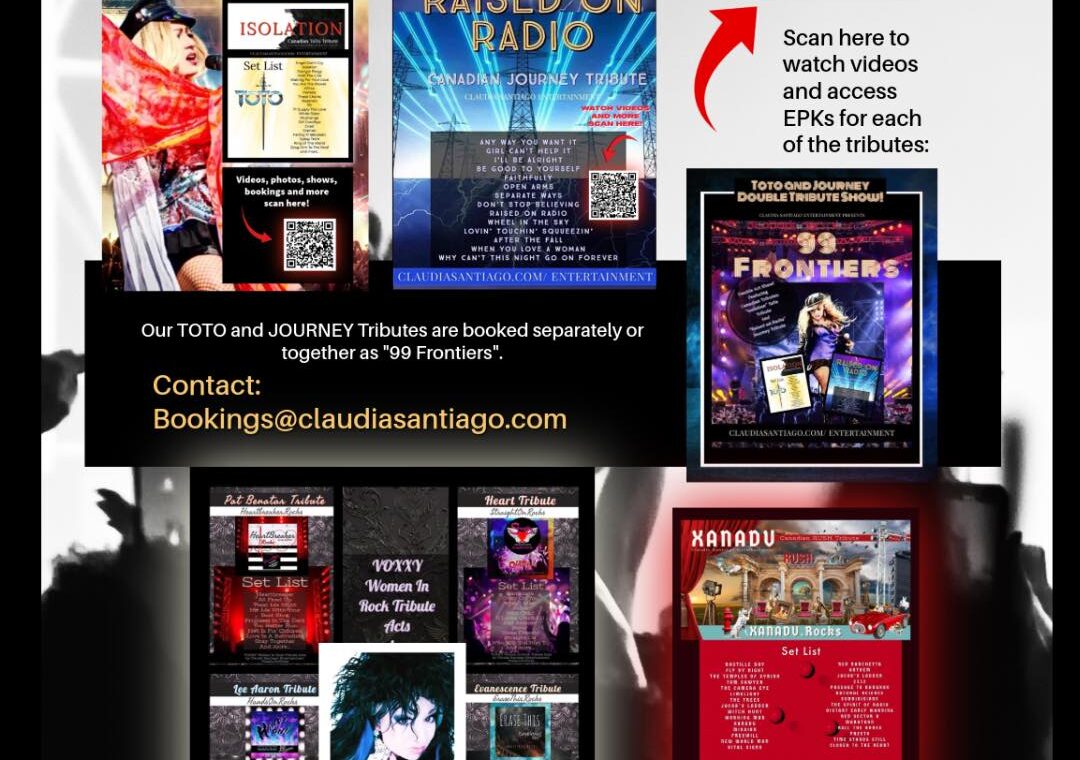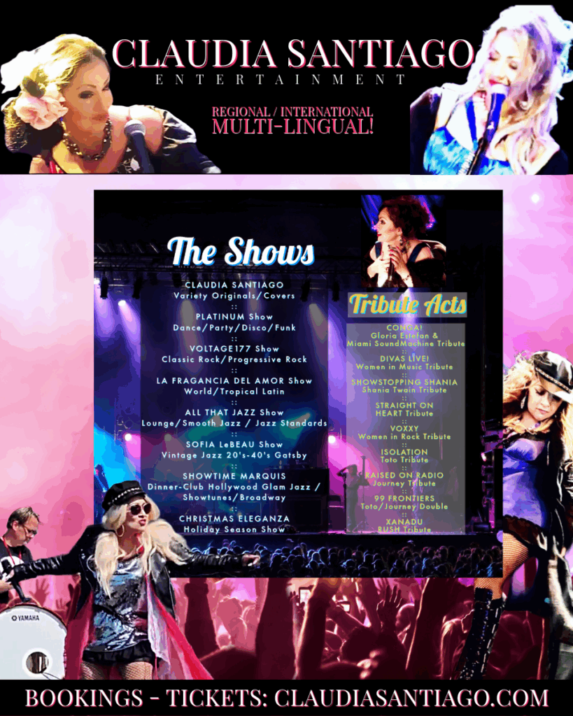 As a recording artist, Claudia Santiago has various commercial original music releases available globally across digital such as “Bring My Angel Down To Earth, “So Fragile”, “Silver Lining”, “Spanish Heaven”, and upcoming new series of releases that she also incorporates into her live specialty shows and tribute acts. (see live event production and new music news below).