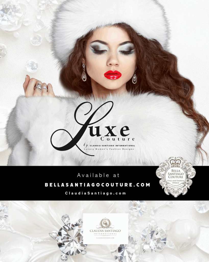 Now she brings you what her audiences have requested for so long, that she share her beauty and fashions! Welcome LUXE Couture – designer luxury fashions by Claudia Santiago – leathers, faux furs, chiffon, organza, crepe, rhinestone beading in her garments whether they be glamour dresses, jackets, scarves, wraps etc.