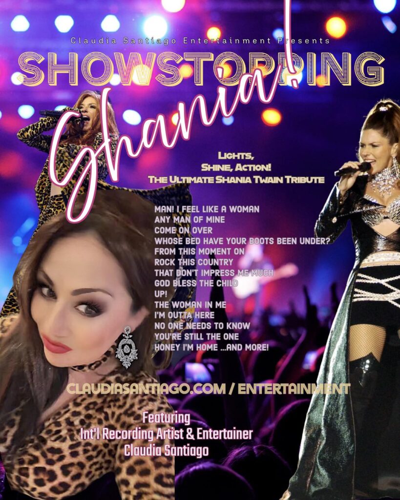 No stranger to private and corporate events, Claudia Santiago brings to the festival and Stampede stage “SHOWSTOPPING SHANIA!” Tribute to Shania Twain. Giddy up and let’s gooooo! A full celebration and kick up you heels to Shania’s hits over the years. Claudia Santiago brings a heel stompin’ rockin’ band and show full of Shania glitz, glamour and country costuming with music hits concert experience you and your guests will enjoy! Now booking for Stampede Rodeo and Summer Festival season.